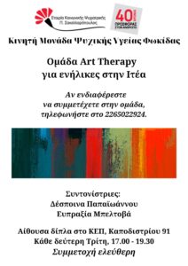 Δελτίο τύπου Νέα Ομάδα Art Therapy στην Ιτέα Ομαδική εικαστική ψυχοθεραπεία (art therapy) [...]