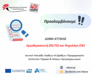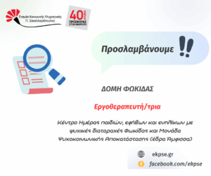 ΠΡΟΣΚΛΗΣΗ ΕΚΔΗΛΩΣΗΣ ΕΝΔΙΑΦΕΡΟΝΤΟΣ ΓΙΑ ΥΠΟΒΟΛH ΑΙTΗΣΕΩΝ ΓΙΑ ΘΕΣΗ ΕΡΓΑΣΙΑΣ ΕΡΓΟΘΕΡΑΠΕΥΤΗ / ΤΡΙΑΣ ΣΤΗ ΔΟΜΗ ΦΩΚΙΔΑΣ, ΚΕΝΤΡΟ ΗΜΕΡΑΣ ΠΑΙΔΙΩΝ, ΕΦΗΒΩΝ ΚΑΙ ΕΝΗΛΙΚΩΝ ΦΩΚΙΔΑΣ ΚΑΙ ΜΟΝΑΔΑ ΨΥΧΟΚΟΙΝΩΝΙΚΗΣ ΑΠΟΚΑΤΑΣΤΑΣΗΣ – ΑΜΦΙΣΣΑ, ΤΗΣ ΕΚΨ Π. ΣΑΚΕΛΛΑΡΟΠΟΥΛΟΣ