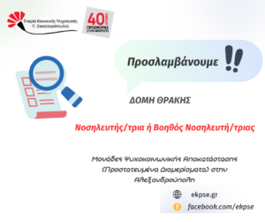 ΠΡΟΣΚΛΗΣΗ ΕΚΔΗΛΩΣΗΣ ΕΝΔΙΑΦΕΡΟΝΤΟΣ ΓΙΑ ΚΑΛΥΨΗ ΘΕΣΗΣ ΕΡΓΑΣΙΑΣ ΣΕ ΜΟΝΑΔΕΣ ΨΥΧΟΚΟΙΝΩΝΙΚΗΣ ΑΠΟΚΑΤΑΣΤΑΣΗΣ ΤΗΣ ΕΚΨ Π. ΣΑΚΕΛΛΑΡΟΠΟΥΛΟΣ ΣΤΗΝ ΑΛΕΞΑΝΔΡΟΥΠΟΛΗ -ΘΕΣΗ ΝΟΣΗΛΕΥΤΙΚΗΣ-