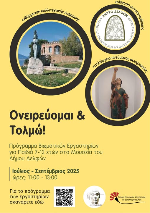 Το Δίκτυο Δελφών για τον Πολιτισμό και τον Τουρισμό, σε συνεργασία με το Δήμος Δελφών και την Εταιρία Κοινωνικής Ψυχιατρικής Π.Σακελλαρόπουλος, υλοποιεί το καλοκαίρι του 2025 ένα ξεχωριστό πρόγραμμα βιωματικών εργαστηρίων για παιδιά ηλικίας 7-12 ετών, με τίτλο: «Ονειρεύομαι και Τολμώ! Κοιτάζω μέσα μου και ακολουθώ την καρδιά μου.»