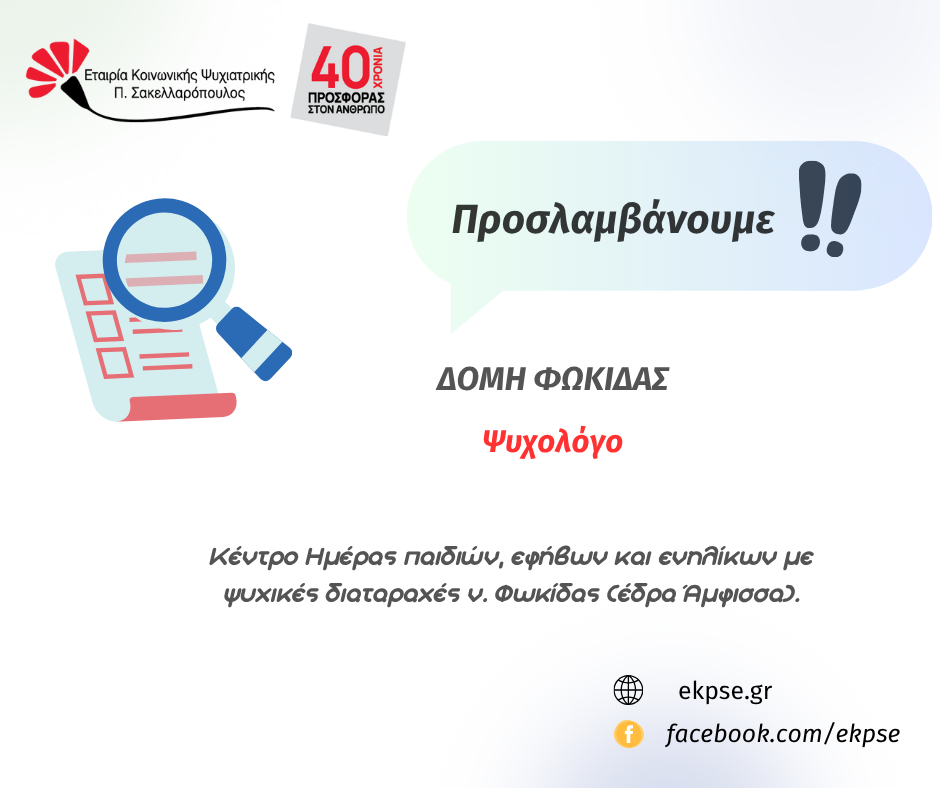Η Εταιρία Κοινωνικής Ψυχιατρικής Π.Σακελλαρόπουλος ενδιαφέρεται να καλύψει μία (1) θέση εργασίας, ειδικότητας ψυχολόγου, στο Κέντρο Ημέρας παιδιών, εφήβων και ενηλίκων με ψυχικές διαταραχές ν. Φωκίδας (έδρα Άμφισσα).