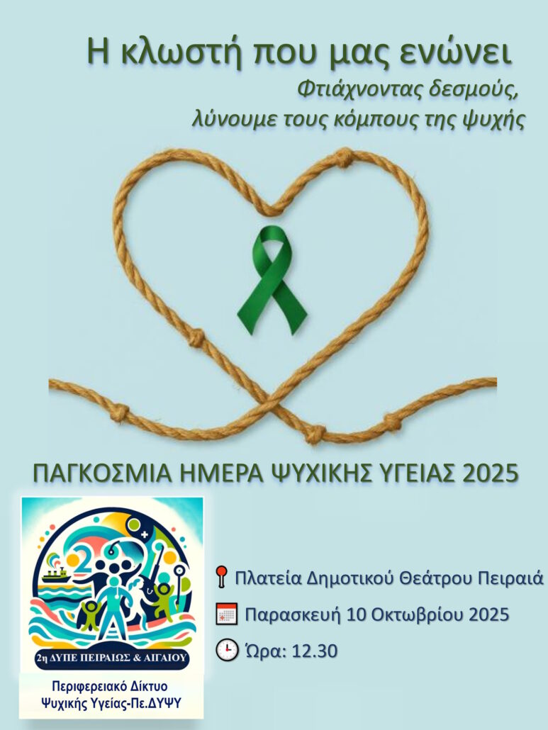 Οι μονάδες ψυχικής υγείας της Ε.Κ.Ψ. Π. Σακελλαρόπουλος στην Αττική θα συμμετάσχουν στην εκδήλωση της 2ης Υγειονομικής Περιφέρειας Πειραιώς και Αιγαίου για την παγκόσμια ημέρα ψυχικής υγείας με τίτλο: <<Η κλωστή που μας ενώνει. Φτιάχνοντας δεσμους, λύνουμε τους κόμπους της ψυχής>>. Οι επαγγελματίες ψυχικής υγείας των μονάδων μας θα ενημερώσουν τους πολίτες για τις παρεχόμενες υπηρεσίες και θα ευαισθητοποιήσουν την κοινότητα σχετικά με σημασία της αναζήτησης βοήθειας από τους ειδικούς.